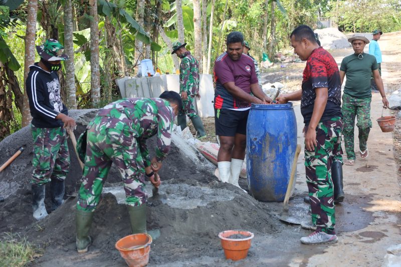 Ada sekitar hampir 60 orang ikut serta membantu pembangunan talud, jalan dan saluran. Mereka bahu membahu bersama prajurit TNI melakukan pengerjaan bangunan.